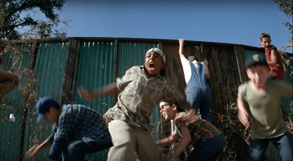 One day, one of the boys hits a baseball clean over the fence.  And to Scotty’s surpise, the other boys treat this hit like an automatic home run.  They don’t even try to go over the fence and get the ball back.  Scotty is already out in the outfield, so he yells to the other boys, “Wait a sec, I’ll get it!” and he starts to climb the fence.  In response, the other boys all scream, “NOOO!” and they all immediately run across the field to Scotty and physically drag him back down onto the ground.  Scotty is annoyed and confused by this, but the boys all hold him back, shouting in chorus, “What are you doing??  You could have been killed!”