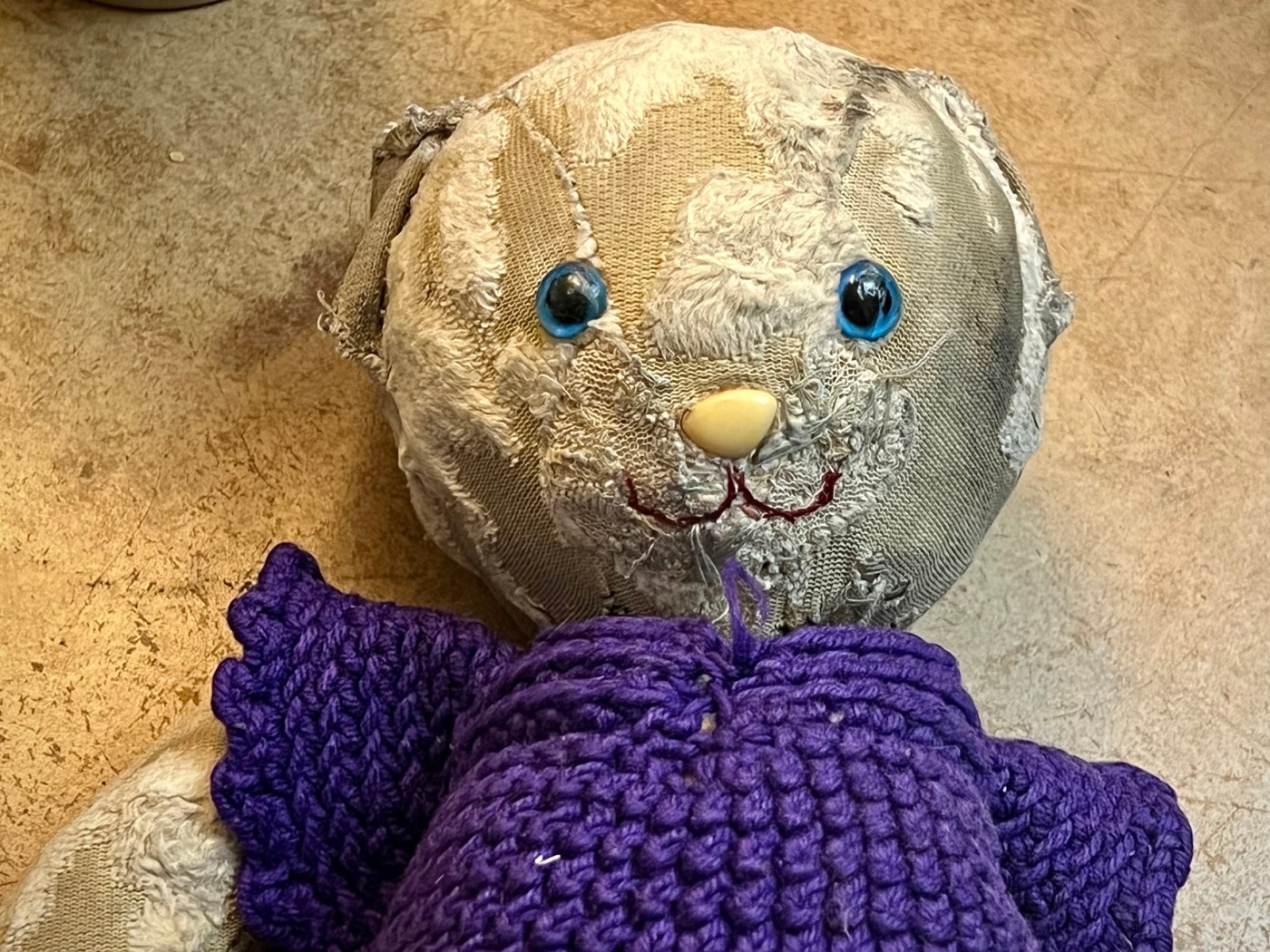 After my mom died, I took over the task of repairing Miss Kitty myself. If you look at her closely, you can still see some of my mom’s tidy stitches, and then basically a whole tapestry of me gradually learning to sew on my own. I love that Miss Kitty is kind of a collaborative project that my mom and I both worked on. I actually made her this little dress back in high school, when I was learning how to crochet. And even though I don’t drag her with me absolutely everywhere I go anymore, she has still come with me pretty much everywhere I’ve moved, from college to camp to Peace Corps to grad school – and now to Schuyler.