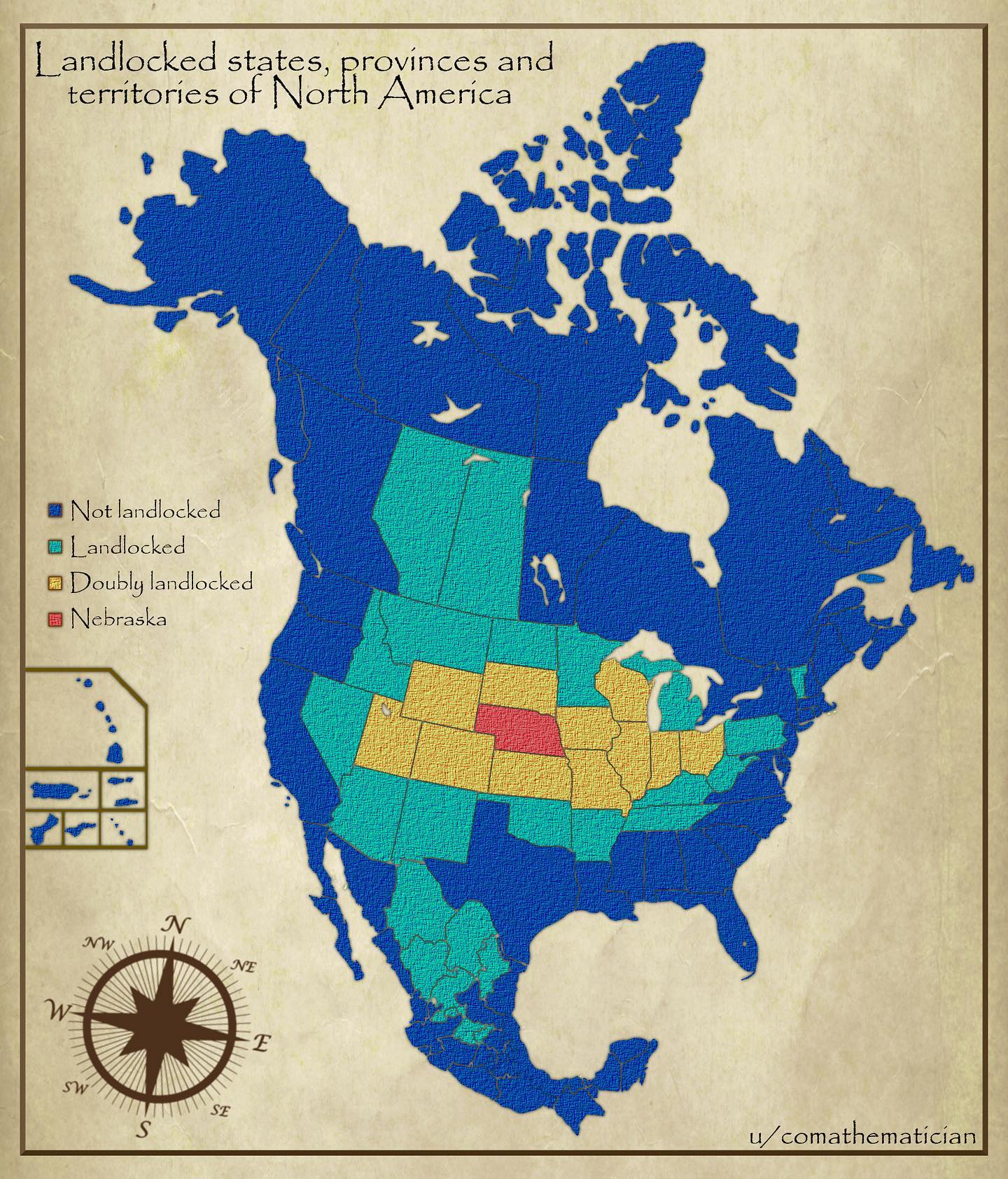 There is a map of North America that makes the rounds on social media from time to time. It shows every single state and province on the continent, each one color-coded by how close it is to the ocean. There are coastal states in blue, then landlocked states, then double landlocked states. And right in the middle of the map, there is one lone state in red: Nebraska. We hold the distinction of being the only triply landlocked state in North America – meaning that no matter which direction you go, you have to go through at least three other states before you reach the ocean.